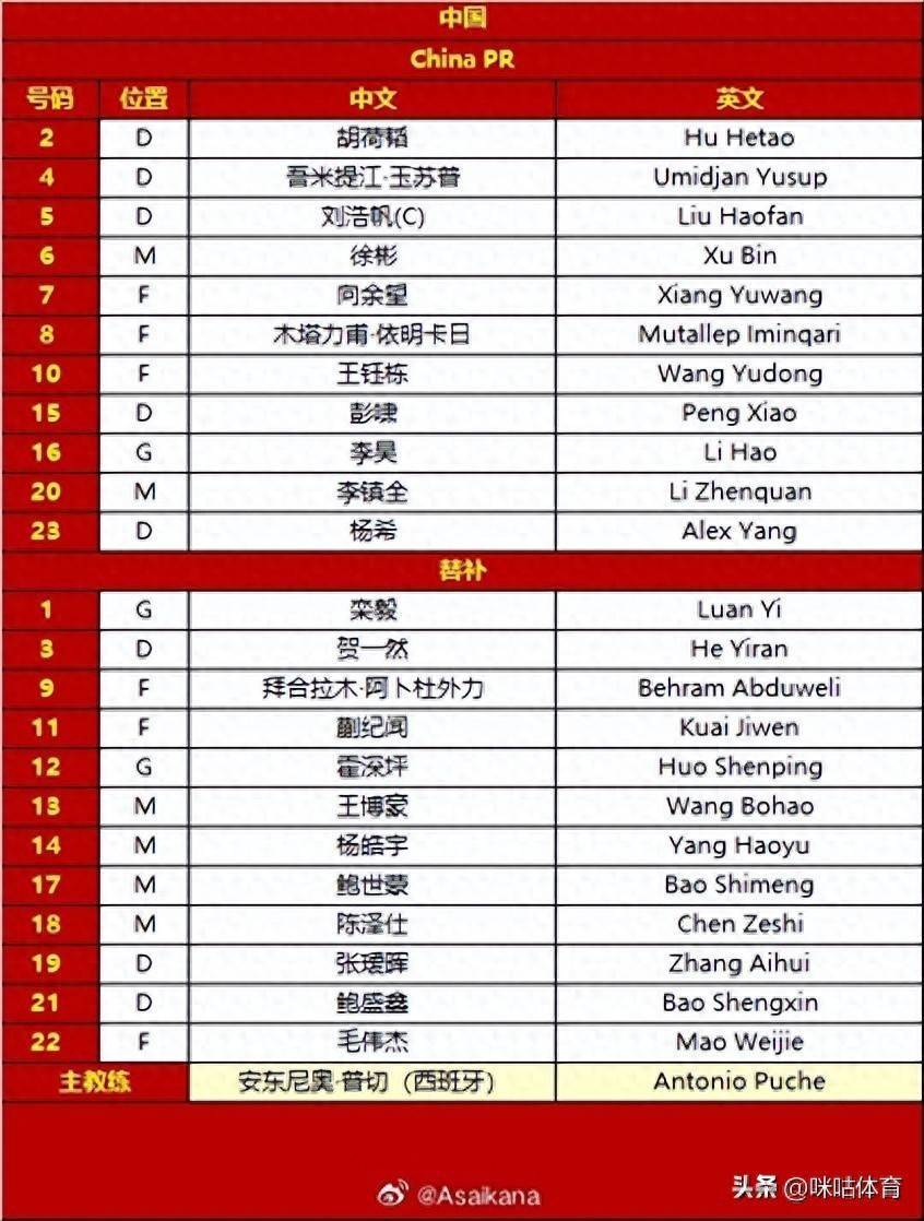 U23国足首发:16-李昊、2-胡荷韬、4-吾米提江、5-刘浩帆、15-彭啸、23-杨希、6-徐彬、20-李镇全、7-向余望、8-木塔力甫、10-王钰栋