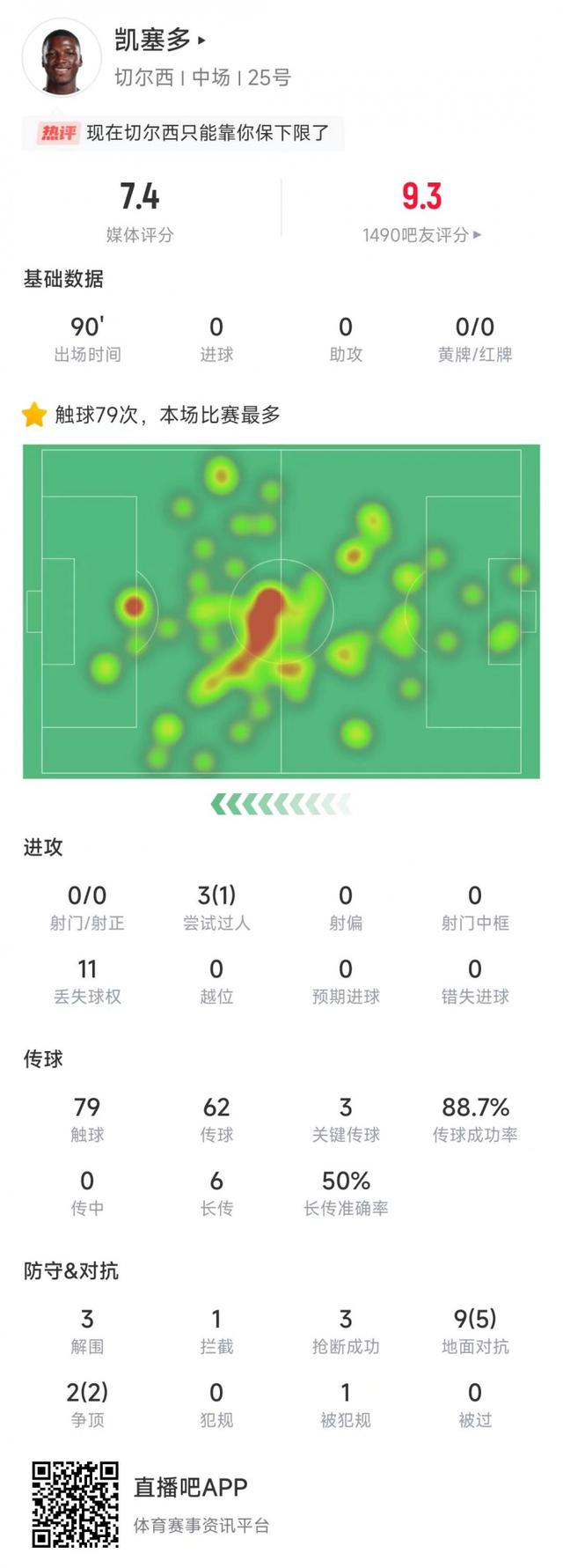 切尔西官方晓示,凯塞多当选本场比赛切尔西队内最好球员。