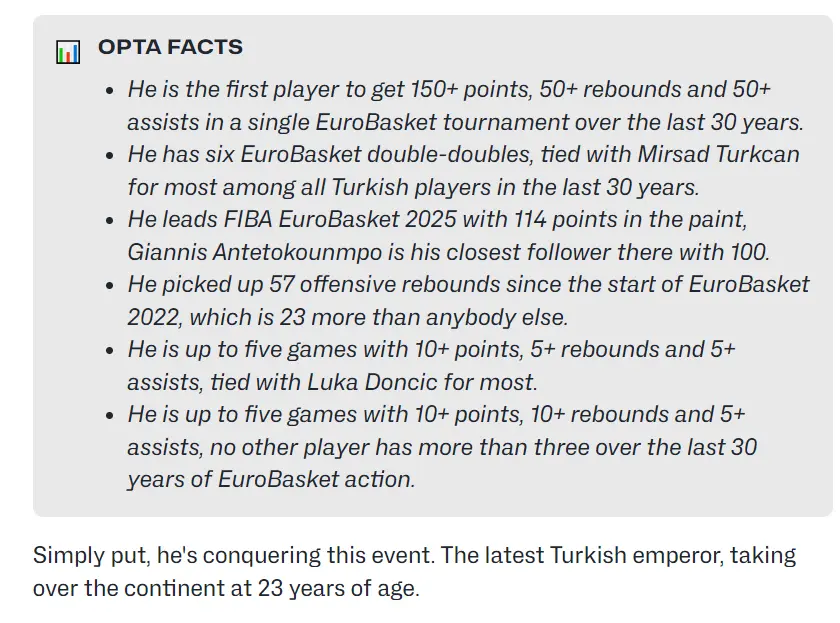 阿尔佩伦-申京在欧洲杯上依然豪取八连胜体育集锦,他初度莫恰当选单场最好,这场比赛的最好球员是奥斯马尼,他胜利冰封扬尼斯还射中6个三分球,虽然申京是幕后元勋,希腊的多东谈主包夹让申京传出许多大空位。