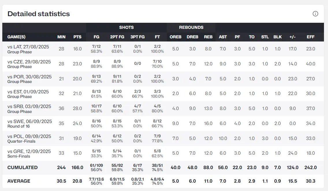 6.往时30年欧洲杯,他剖判得分、篮板上双且助攻超5次,莫得球员能升迁这么的数据三次;