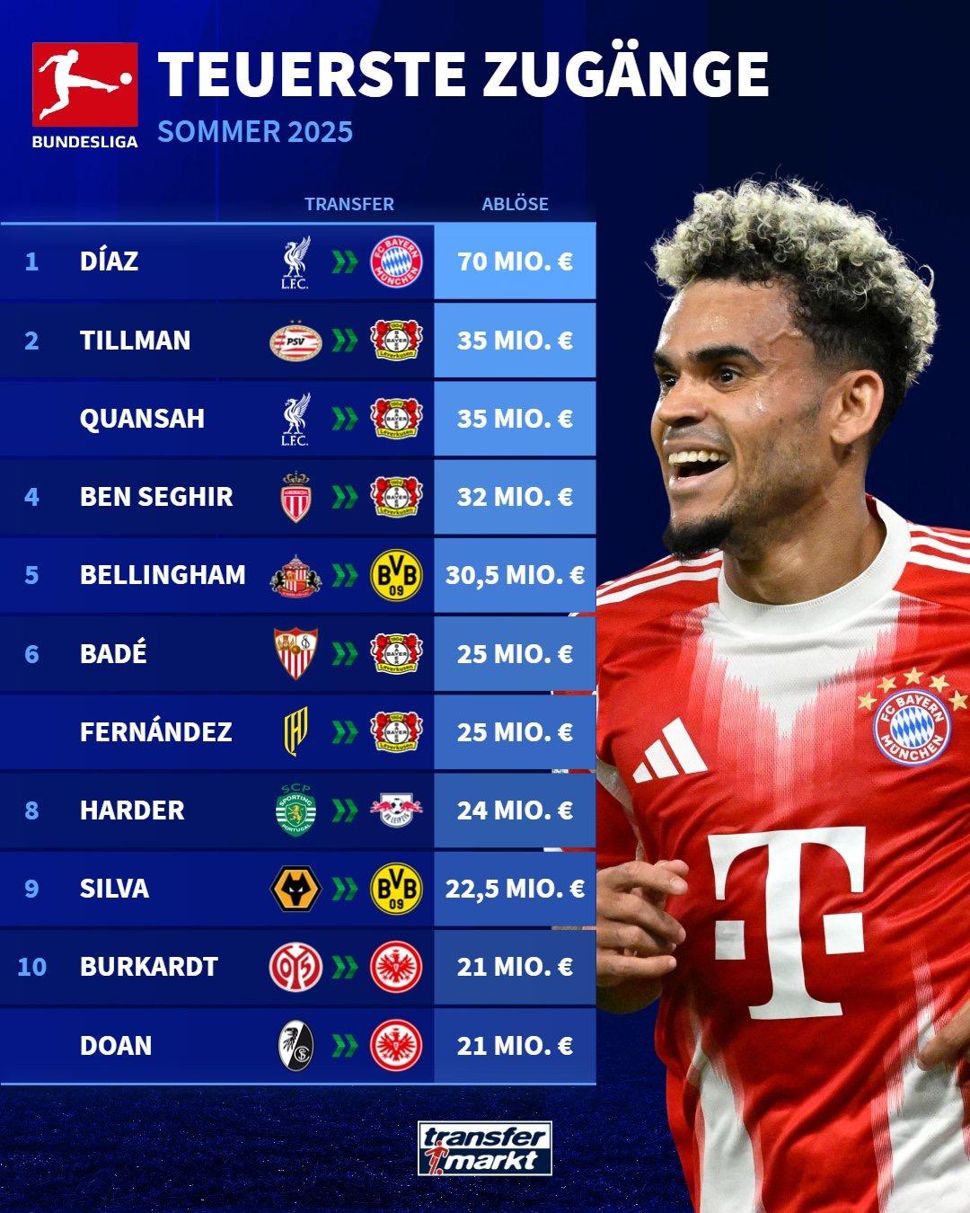 虎扑09月03日讯 德转给出了德甲球队今夏最贵前十引援,利物浦边锋路易斯-迪亚斯以7000万欧元转会至拜仁慕尼黑体育赛事直播,成为本次夏窗德甲最上流的引援。具体如下: