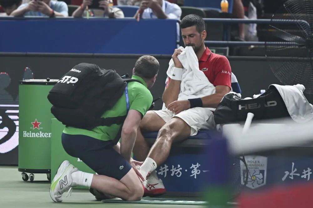 △ 10月7日,德约科维奇在比赛中给与治愈。新华社记者 陈浩明 摄